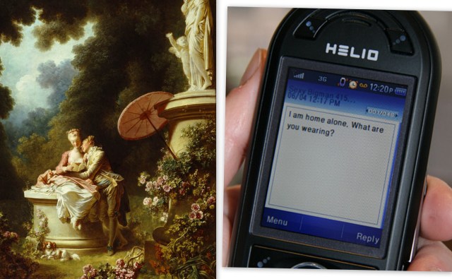 In Fragonard’s series, this actually comes last — the happy couple send letters to reinforce their eternal love for one another. Today, I’m not sure how many people exchange handwritten love letters any more. However, the exchange of love notes in 2010/11 take on many forms, thanks to BBM and text messages. Fingers shoot across miniature keyboards in rapid-fire, concise exchanges. “Wanna come over?” “what r u wearing” “;)” NC-17 camera phone images strengthen the lust, while the occasional “i miss u” or “dinner 2nite?” tug at the heart strings.